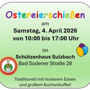 Training Offenes Training für alle von 0-99. ... 24 Apr. 17:00 - 20:00 Schützenverein 1967 Sulzbach e. V.Bad Sodener Str. 28, 65843 Sulzbach (Taunus)